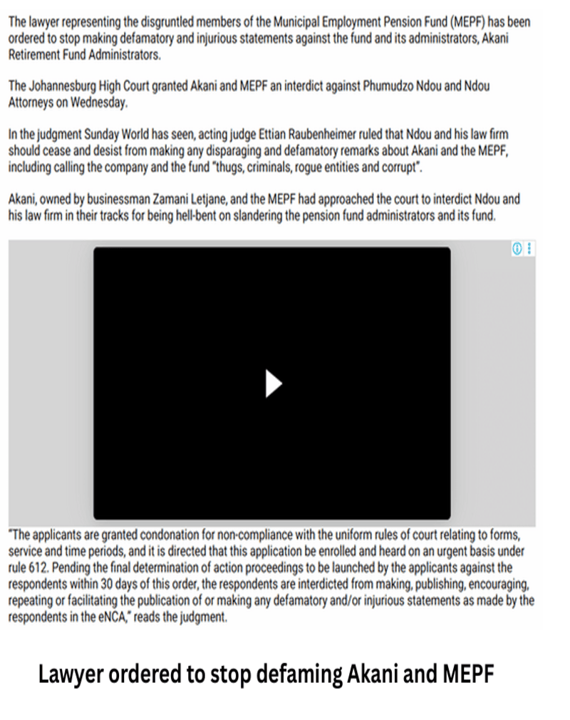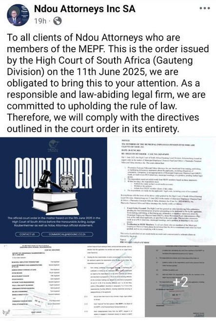We welcome the ruling handed down on 11 June 2025, where the court ordered Mr. Phumudzo Ndou and Ndou Attorneys and Associates to retract all defamatory statements made against MEPF and Akani RFA on their social media platforms. This decision upholds the Fund’s reputation and reiterates our dedication to ethical governance and legal compliance.